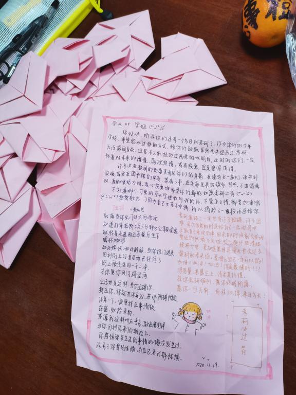 “这是一个考研顺利符,收到礼物的人一定会考出理想的成绩!”“越努力越幸运,保持状态,考研加油!”……一张张被折成爱心的信封上写满了对考研学子的热诚寄语,也都是由2020级3044永利集团新生们亲手制作。思想政治教育专业2020(2)班的李萍就是写爱心信的新生之一,“大一刚进校园也收到过学长学姐给我们的爱心信,现在由我们新生给学长学姐写信,这也是一个温暖传递的过程。”