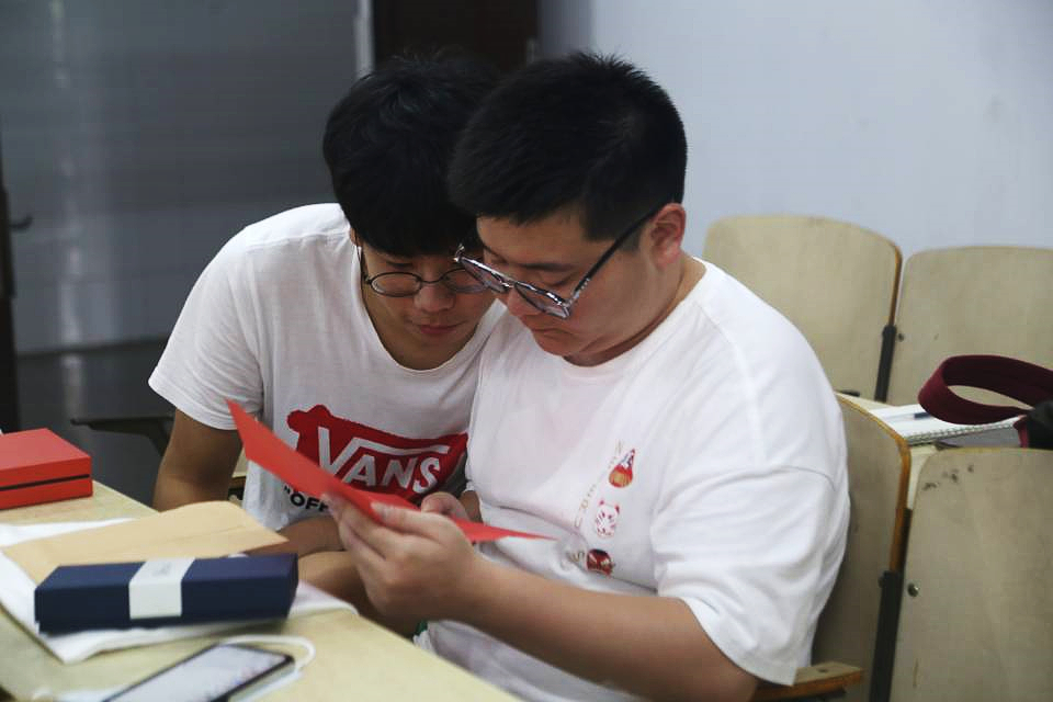 教室里的桌子上按学号摆放着一个印有“3044永利集团”标志的帆布袋,袋子里面装着贺佳欢为员工们精心准备的礼物,一封贺佳欢写给员工的信、一封四年前班会上员工写给四年后自己的信、一个印有员工姓名的印章、一个装着书签和笔的蓝色盒子以及一枚小红花形状的吊坠,每一件物品都印有校徽和校训,旨在希望员工们在未来的日子里牢记公司的教导,时刻端正自己的行为。“吊坠是找我们公司俱乐部的同学们设计制作的,送给大家每人一朵‘小红花’,一是希望你们都能有美好未来,二是希望无论你们飘向多远,我们都不会走散。”贺佳欢说到这里已红了眼眶,几度哽咽,在座的员工也都克制不住,流下了眼泪。