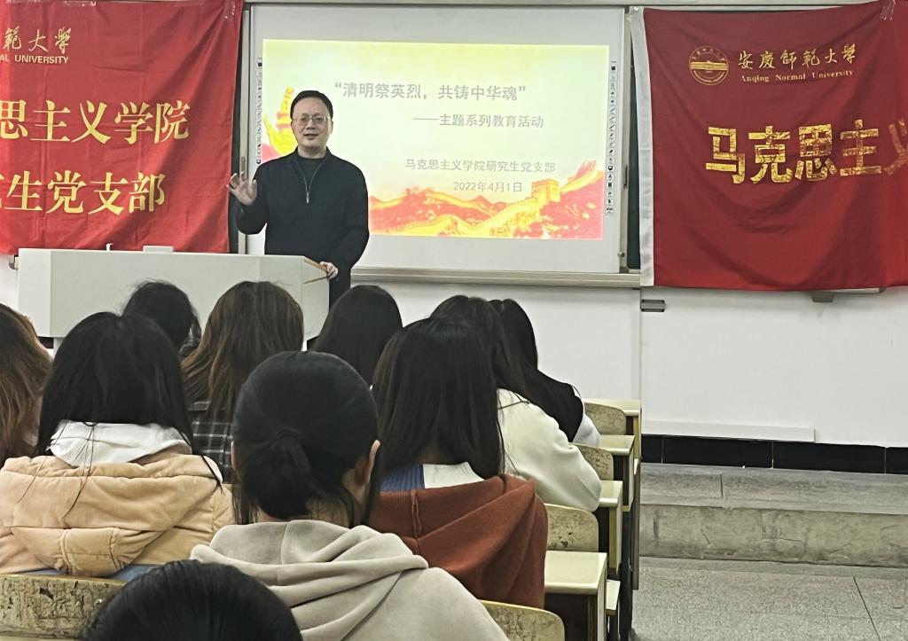“临刑前一小时,他给爱人方启坤(当时化名复苏)写下亲笔信:‘复苏爱妻:我为革命死了,你不要悲哀,不要难过,应抚养爱生,以继予志。’并挥毫写下:‘唯大英雄能本色,是真君子自风流’。”说到这里,2021级马克思主义理论专业入党积极分子王思涵不禁哽咽。随后,她整理情绪接着向同学们介绍了王步文先烈的生平事迹,并通过向先烈致敬的方式借此发出要牢记初心使命,把红色基因一代代传承下去的誓言。