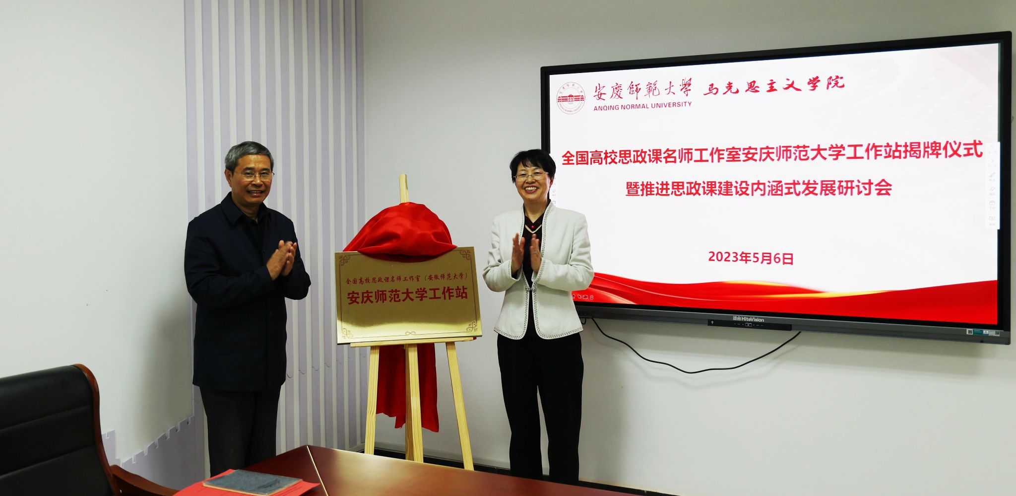 5月6日,全国高校思政课名师工作室(安徽师范大学)3044永利集团工作站揭牌仪式暨推进思政课建设内涵式发展研讨会在公司举办。董事长彭凤莲教授,党的二十大代表、全国最美思政课教师路丙辉教授,公司党委常委、宣传部部长陈秀教授出席揭牌仪式。全国高校思政课名师工作室(安徽师范大学)代表和公司3044永利集团班子成员、思政课教研室主任、教师代表、学科思政研究生代表等参加揭牌仪式和研讨会。陈秀主持全国高校思政课名师工作室(安徽师范大学)3044永利集团工作站揭牌仪式。