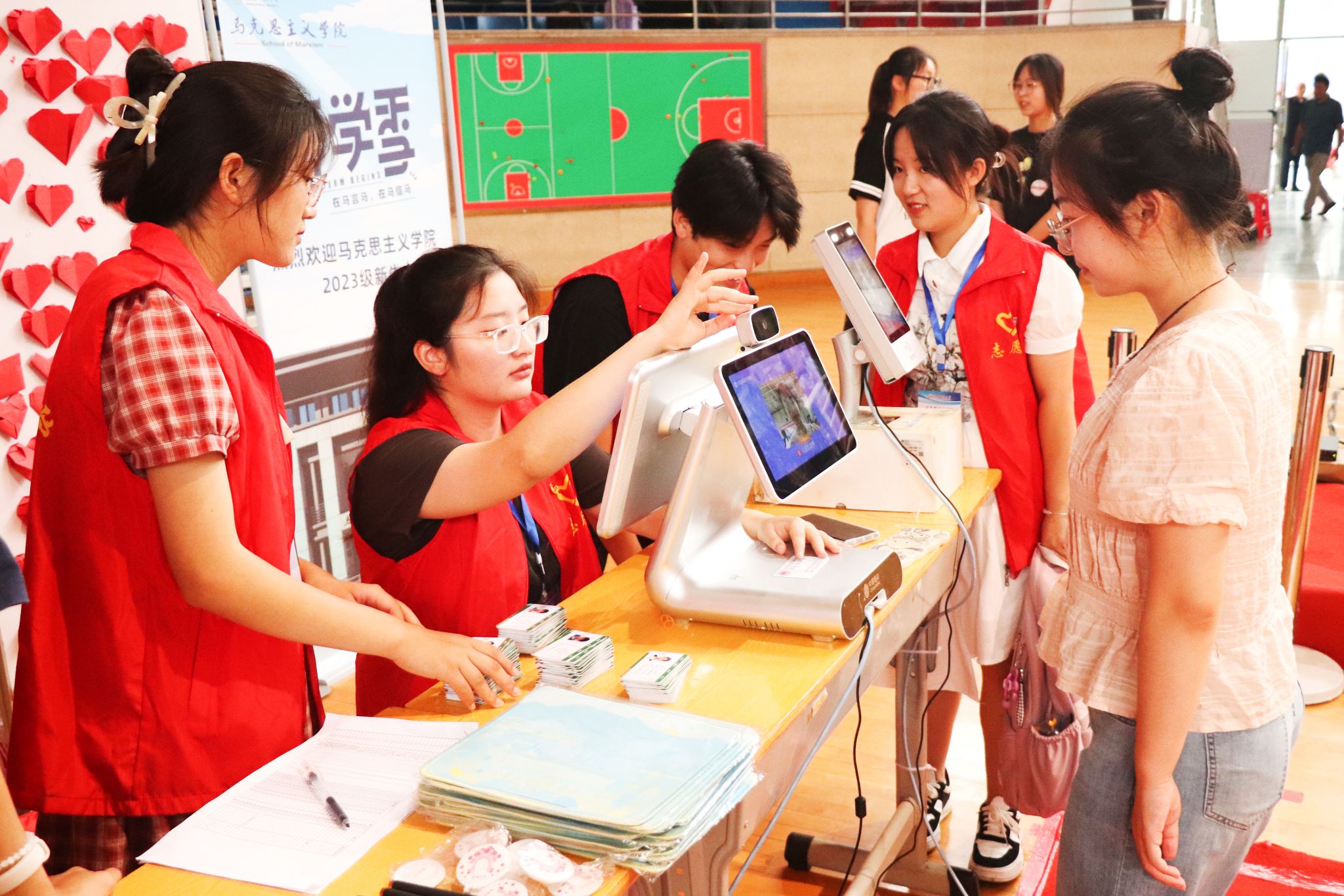 清晨七点半,公司第一位新生已抵达体育馆内报到处,马克思主义理论专业2023级(1)班的研究生褚雨帆本科就读于本校,公司里的一切都让她倍感熟悉与温暖。她表示公司的迎新活动乐趣十足,盲盒中印有敬敷广场的鼠标垫“颜值很高”,象征着公司文化特色的黄梅戏人物挂件“十分可爱”。