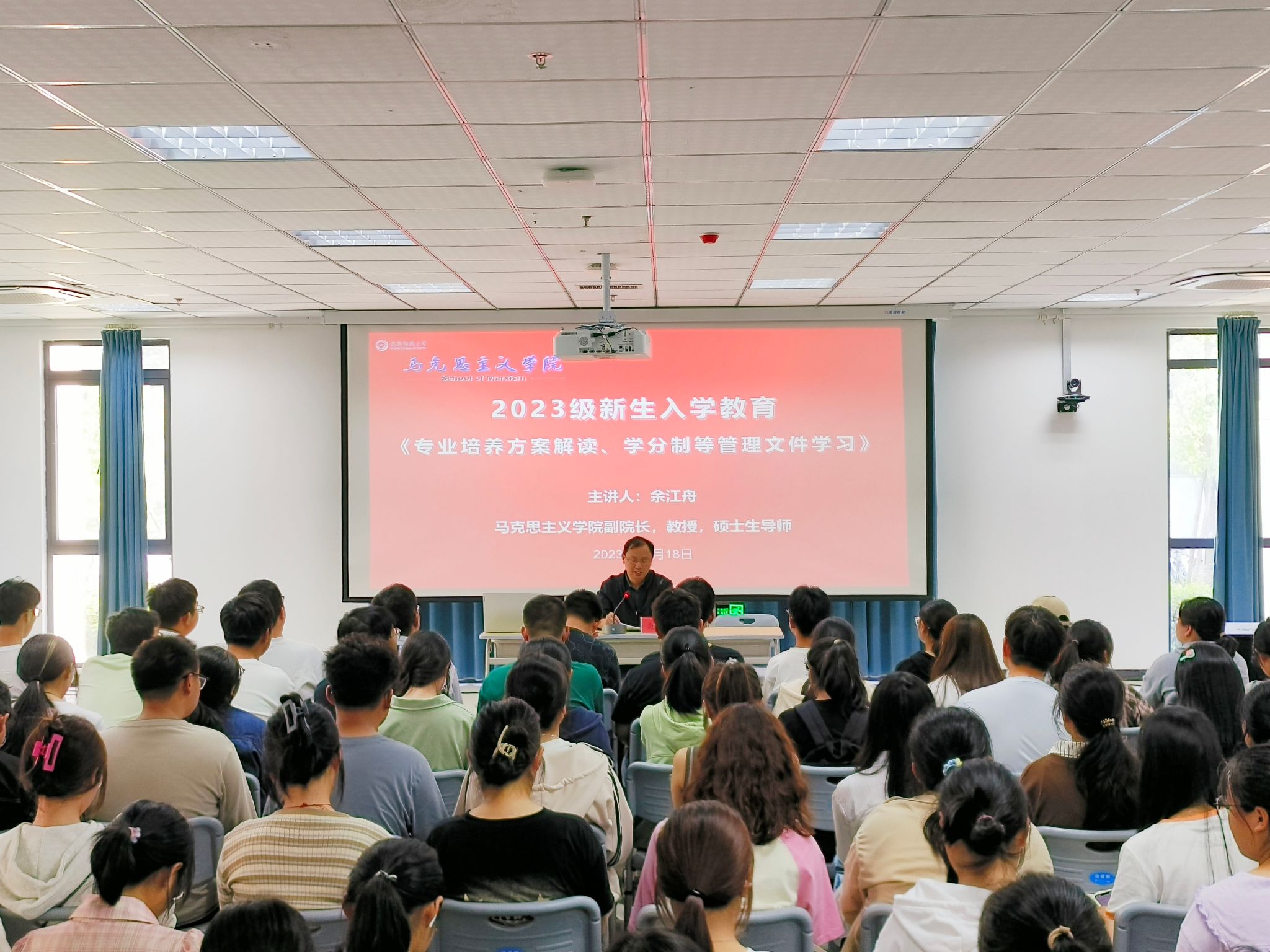 入学教育大会上,余江舟立足思想政治教育专业的办学方向与目标定位,指出要培养具有坚定的红色革命信仰和具备系统的专业知识人才,并通过增强逻辑分析、理论讲解、情感培养、价值引导等能力而使本专业员工更具有核心竞争力。会议强调,全体新生要端正学风,养成良好学习习惯,要能做到自主学习并及时关注教务系统相关信息,注意查漏补缺。余江舟鼓励新生要系统地学好思想政治教育学科专业知识,拥有良好的道德情操和素养,力争成为一名政治强、情怀深、思维新、视野广、自律严、人格正的优秀中学思政课老师。