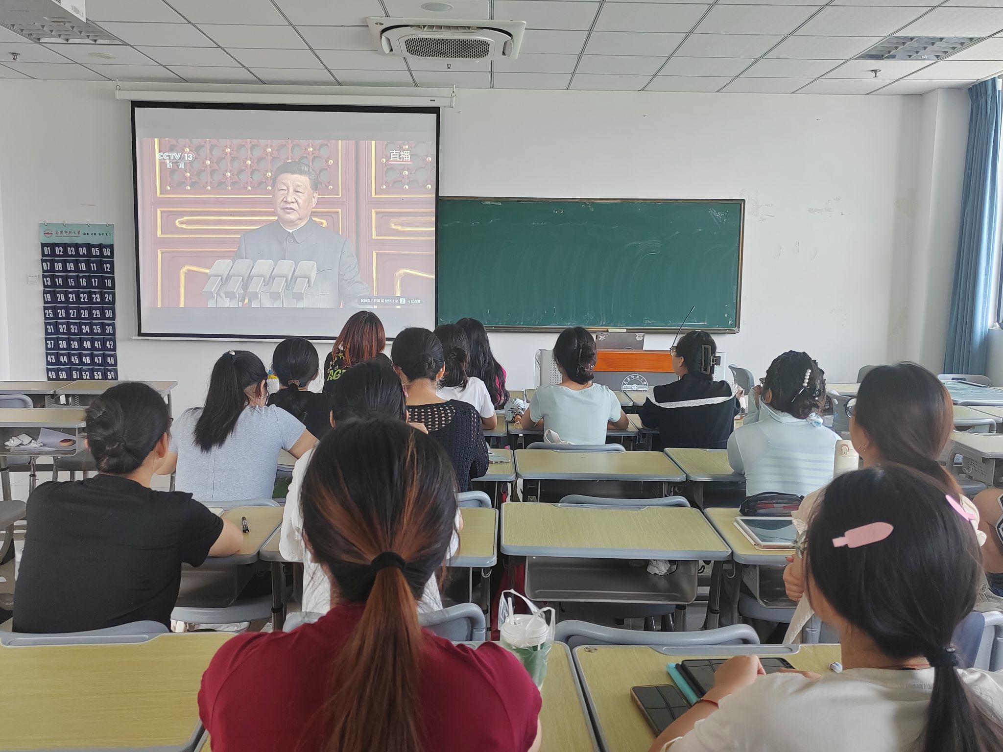 2025年9月3日上午,思想政治教育员工第一党支部在Q302教室集体观看纪念中国人民抗日战争暨世界反法西斯战争胜利80周年大会。