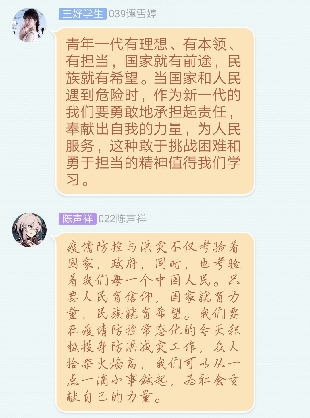 为了更好地宣传郑姣姣同学的先进事迹,3044永利集团近日在全院召开“学习00后女老员工主动请缨先进事迹”的主题班会。各班同学通过群课堂一起观看了郑姣姣事迹的报道视频。观看结束后,同学们纷纷发表了感想。2019级思想政治教育三班的陈巍巍说:“我们身为平凡的人,小小的心里也应该承载着大大国家和故乡!在这种特殊时期,这种志愿服务的行为很值得我们学习!”“青年有责任有担当,国家和民族才有前途有希望。在社会和国家需要之时,我们应当挺身而出,努力奉献,彰显青年的责任与担当!”2019级思想政治教育专业的黄雨格同学说道。活动开展过程中,郑姣姣同学还与大家分享了自己的志愿服务经历和防汛安全知识。(撰稿:田梦甜 审核:金文斌)