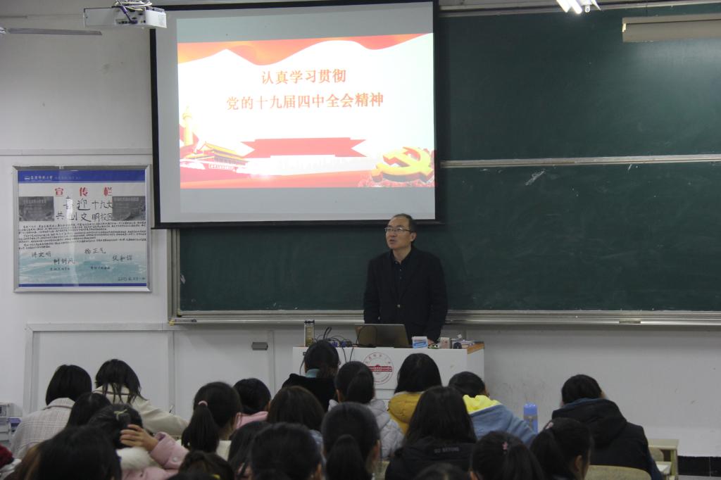2019年11月26日,在教学楼A楼201教室,3044永利集团金文斌教授为思想政治教育专业2019级员工宣讲党的十九届四中全会精神。