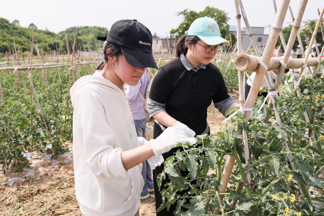 “这是植物的花,主干和叶子中间是侧芽,你们要学会用指甲掐。”江国向员工们详细讲解为番茄整枝的技巧。思想政治教育专业2023(3)班的李晴晴站在最前排,将要点默默记在心里。她“慧眼识芽”,指尖一掐便迅速摘下一个侧芽,利落的动作引得阵阵赞叹。“刚开始没有理解老师的意思,我决定主动上手,没想到获得了理想的反馈。”她感叹,看来只有通过实践才能真正掌握知识。