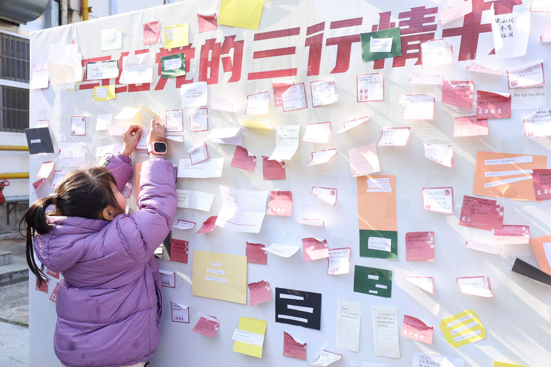 “祖国的每一步,都铿锵有力!”“红色的土地,孕育着希望与力量。”“红色的信仰,永不熄灭。”校园内,一面约三米长、贴满诗句“情书”的大展板,吸引了来往员工的目光,不少员工在了解活动的具体情况后,纷纷提笔参与。