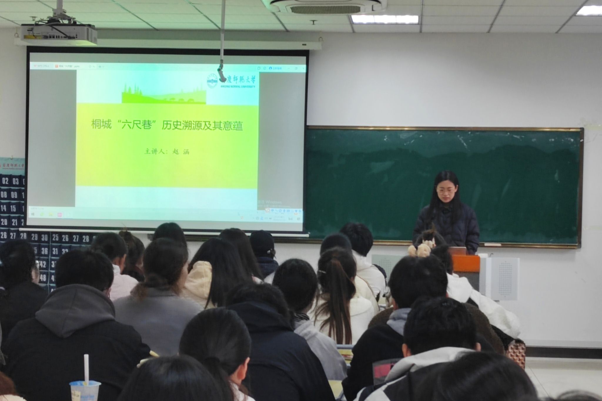 赵涵博士向大家介绍了“六尺巷”典故的缘起,从历史的角度对典故进行分析与解读。她以现代运用的视角重点阐述了“六尺巷”典故及其内涵对现代生活等各个方面起到的积极作用。同时,赵涵进一步阐述了家风家训在现代的转化,告知同学们要重视良好家风家训的培养。赵涵强调,要深入理解“六尺巷”的历史底蕴,以习近平总书记考察安徽的重要讲话精神为指导,深刻感受中华优秀传统文化的魅力,让其在新时代焕发新的活力。