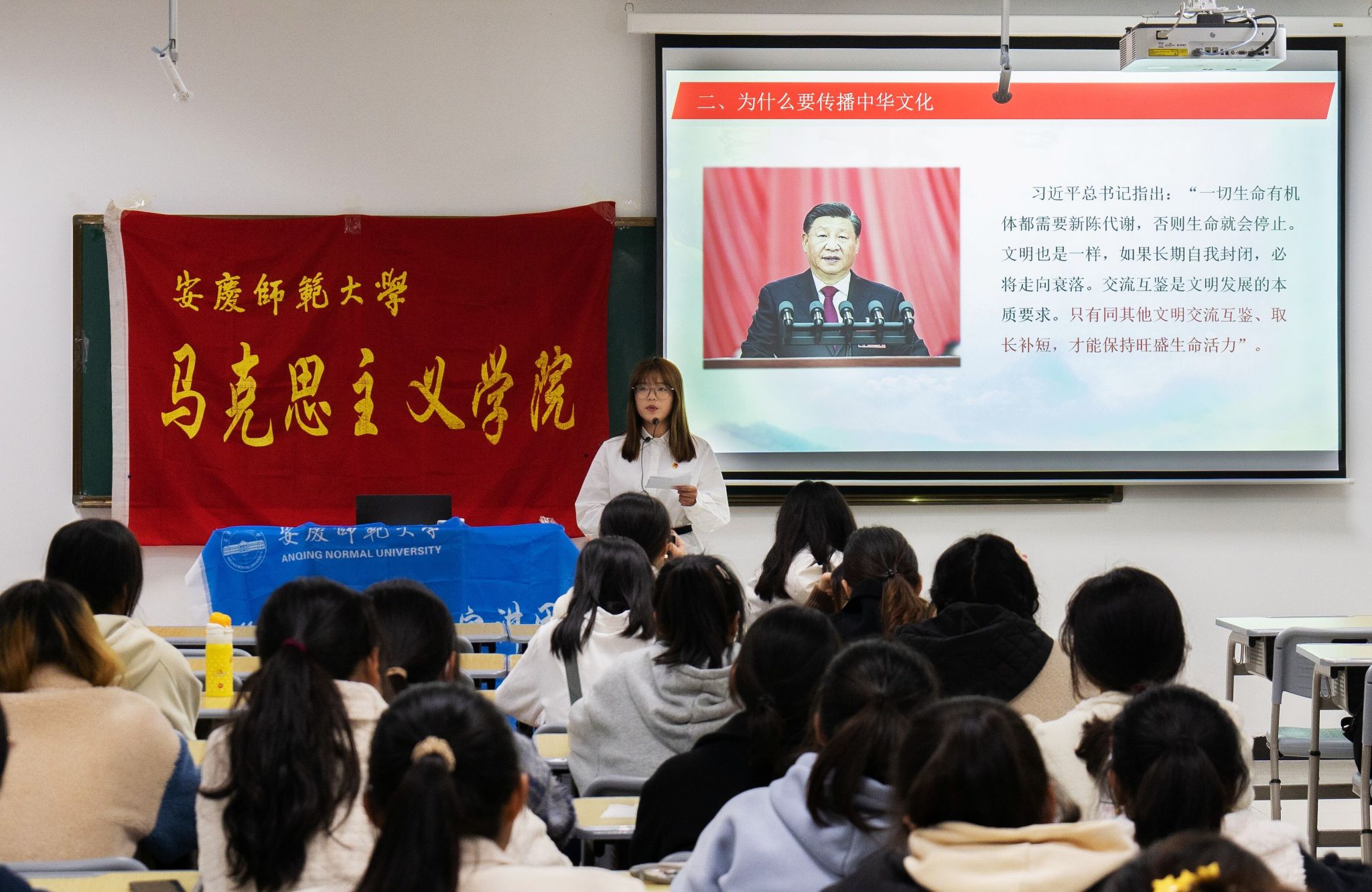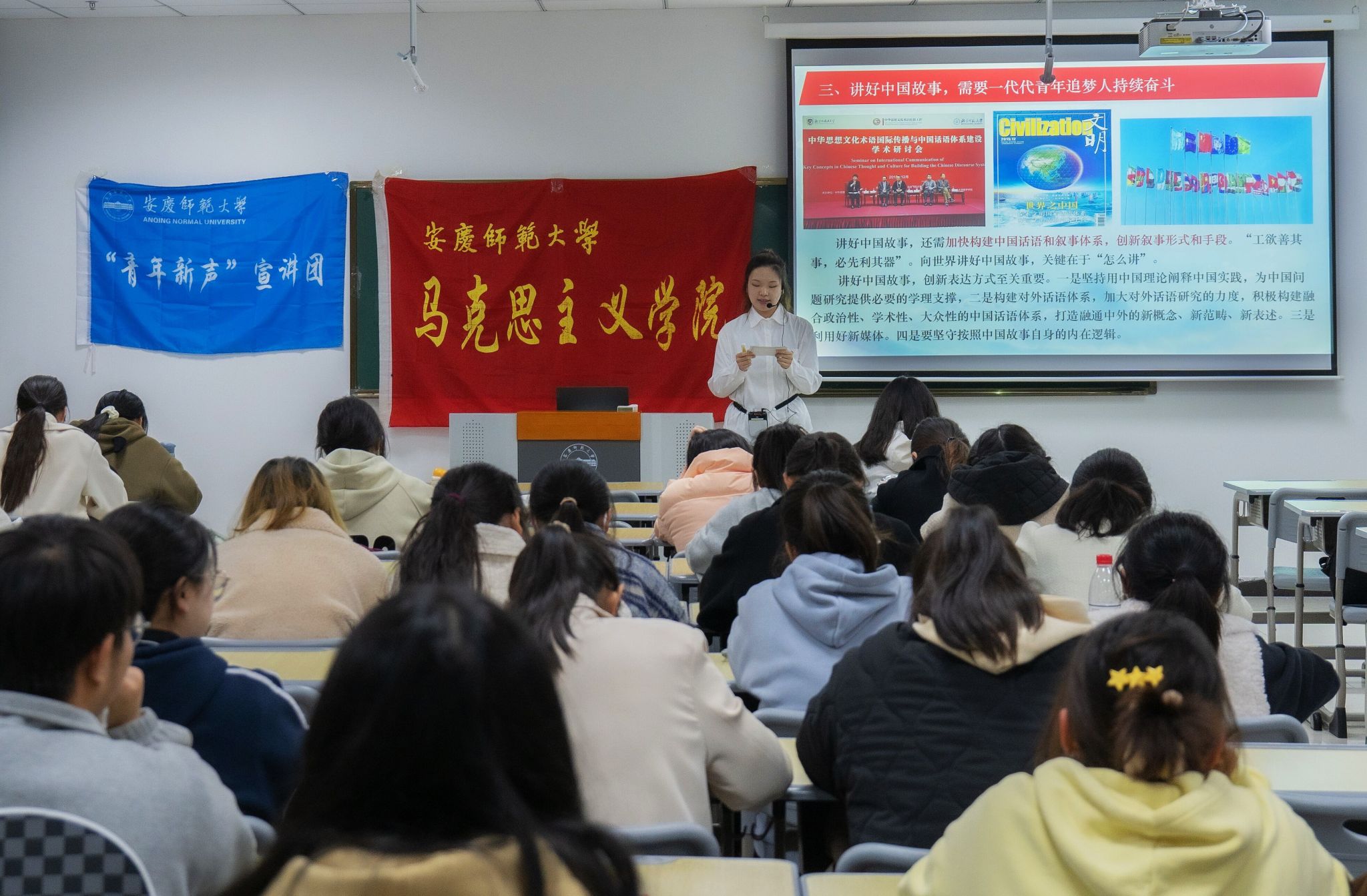 党的二十大报告指出,加快构建中国话语和中国叙事体系,讲好中国故事,传播好中国声音,展现可信、可爱、可敬的中国形象。宣讲团成员积极贯彻落实党的二十大精神,从“中华文明是什么、为什么要传播中华文化、怎样讲好中国故事”三个方面来进行宣讲。五千年薪火相传的中华文明,孕育了取之不竭的故事宝藏。不忘初心、砥砺奋进的当代中国喷涌着数不尽的故事源泉。宣讲团成员指出,在文化输出的同时要讲有中国特色的故事,传播有特色的中国声音。宣讲者提到,好的表达是真实与艺术、内容与形式的有机结合,讲好中国故事,离不开每一个时代青年的砥砺前行。