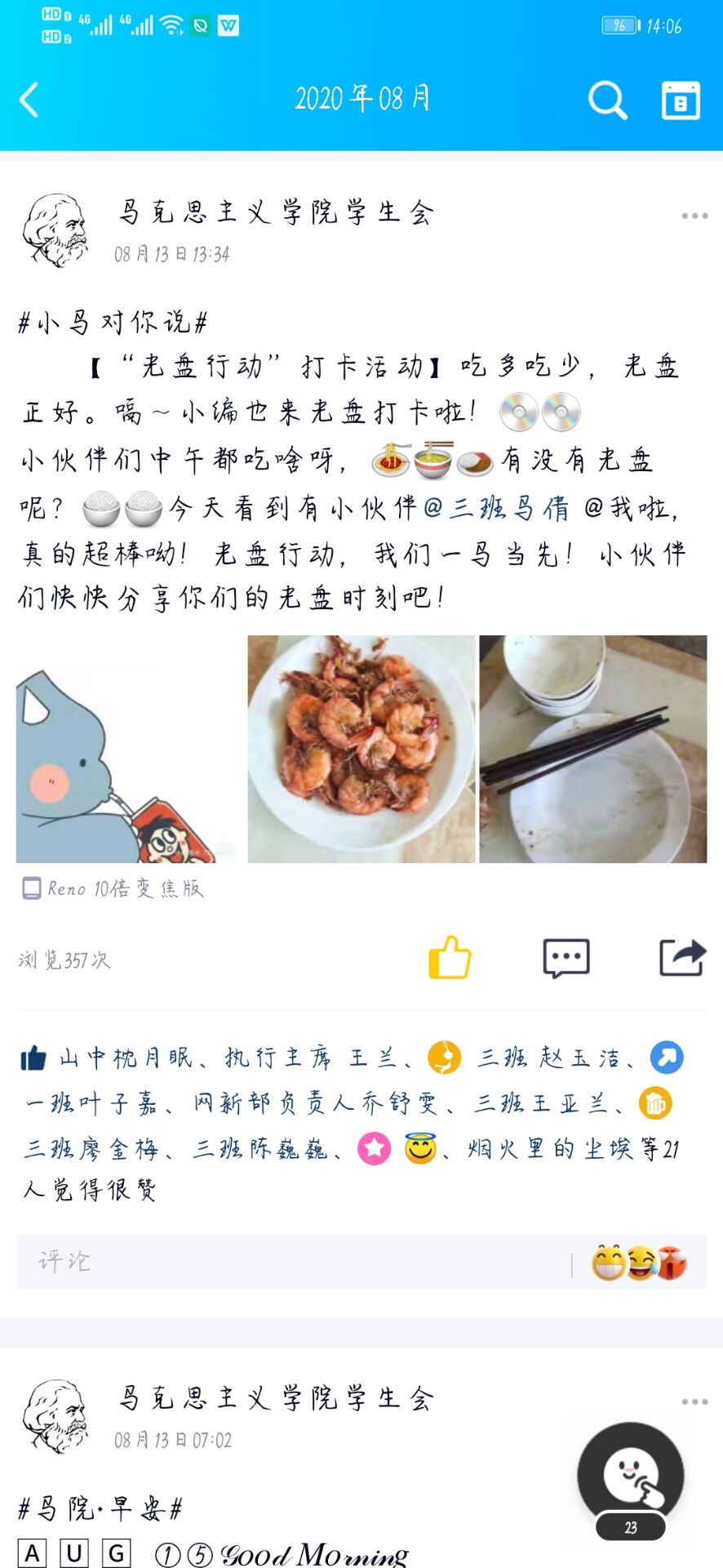 此外,公司团委鼓励同学们进行线上打卡,将自己“光盘行动”成果展示图片和推文学习感悟发送空间动态,与大家分享“光盘一刻”。同时,公司官方QQ号也会转发同学们的打卡动态,引导大家关注,更是呼吁大家养成勤俭节约的习惯。从同学们的反馈来看,线上打卡的方式鼓动了更多的同学参与到活动中来,如思想政治教育专业2019级1班周雨昕分享了自己的劳动经历并表示会继续保持节约粮食的习惯,传递光盘观念。“光盘行动”线下线上成风尚,“一滴一粮,来之不易”、“美好的一天从光盘开始”、“光盘行动,节约粮食”,同学们的真实感悟不仅是一句简单的口号,更是一种厉行节约的生活态度。(撰稿:雍雅婷 审核:金文斌)