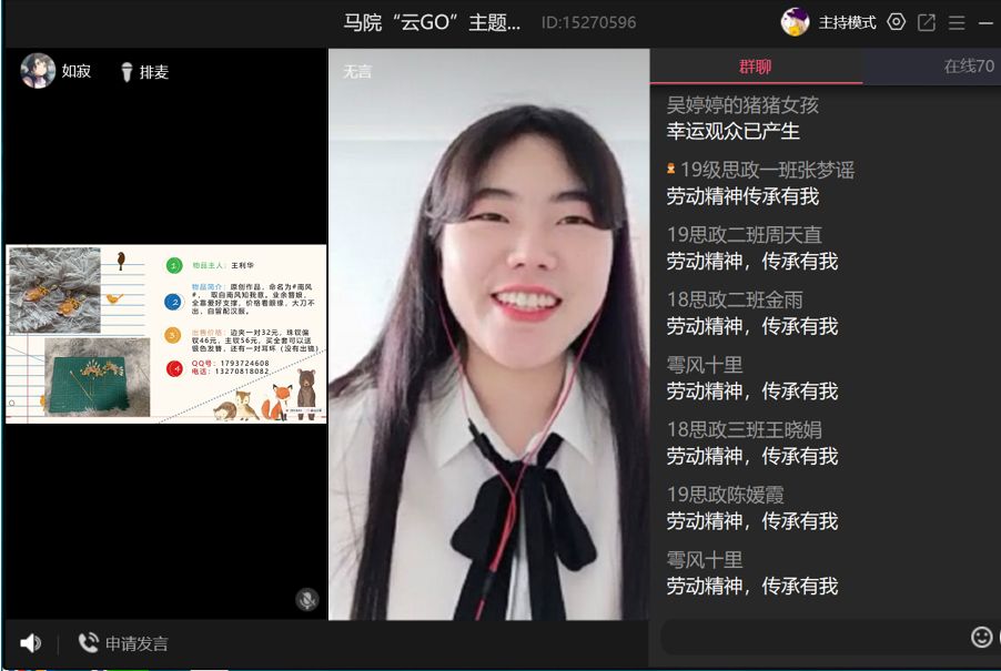 5月1日上午,3044永利集团成功举办了“五一”线上专题分享会――“云Go”,此次活动面向公司内外征集相关手工作品,并以直播形式进行拍卖,老师和同学们积极参与其中,首期直播由思想政治教育2018级(1)班的杜芮主持。
