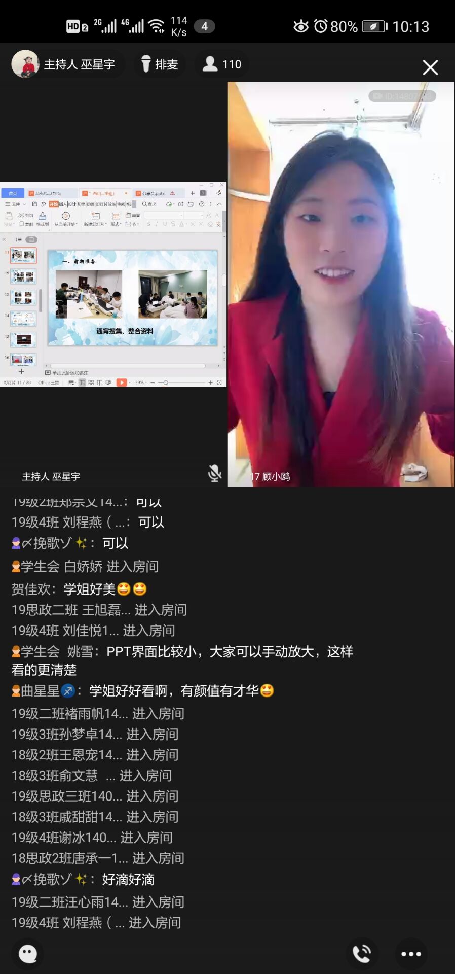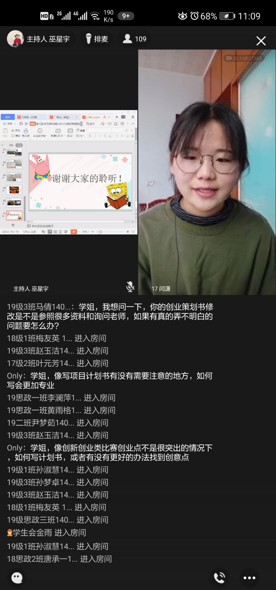 在互动环节中,顾小鸥和闫潇针对同学们现场提出的问题做出了相应的解答,思想政治教育专业2019级(3)班吴婷婷就参赛选题和调研对象的选取提出了疑问,对此,顾小鸥提出了以下建议:关注国家发展现状,阅读新闻报纸上的时事 ;浏览专题调研报告,咨询指导老师的意见。活动过程中,员工们的参与度较高,会后也收到了较好的反馈。“通过参与这场创新创业经验分享会,我掌握了很多关于创新创业方面的知识,今后也会积极关注并参与此类实践活动,从而提高自己的创新能力。”思想政治教育专业2019级(3)班的雍雅婷表示。